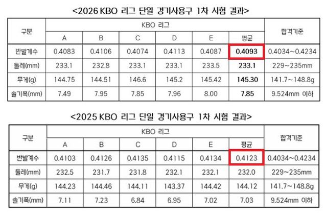 한국야구위원회(KBO)는 '리그 단일 경기사용구인 스카이라인스포츠 AAK-100의 샘플 5타를 각 구장에서 무작위로 수거한 뒤 국민체육진흥공단(KSPO) 한국스포츠개발원 스포츠용품 시험소에 의뢰해 지난 26일부터 28일까지 진행됐다. 검사 결과, 모든 샘플이 합격기준을 충족한 것으로 확인됐다'고 30일 밝혔다. KBO가 밝힌 샘플 5타의 평균 반발계수는 0.4093으로 합격기준인 0.4034~0.4234에 포함됐다. 또한 공의 둘레, 무게, 솔기 폭 등 다른 항목에서도 모두 규정을 만족한 것으로 확인됐다.
