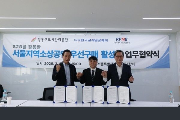 | 서울=한스경제 김종효 기자 | 한국교직원공제회는 지난 26일 성동구도시관리공단, 서울시소상공인연합회와 서울시소상공인연합회 회의실에서 서울지역 소상공인 판로지원을 위한 3자 협약을 체결했다고 30일 밝혔다.