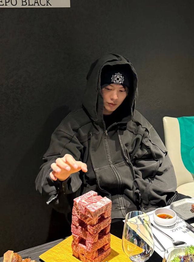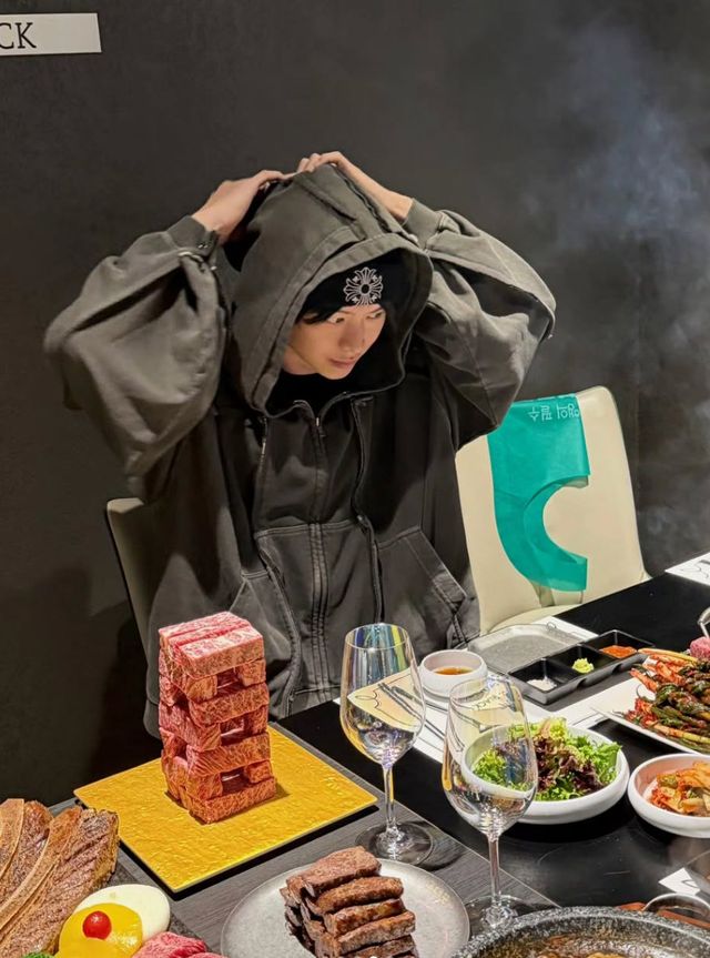 특히 시선을 사로잡은 것은 테이블 위에 높이 쌓인 소고기다. 마치 ‘젠가 게임’을 연상케 하듯 정갈하게 블록 형태로 쌓아 올린 고급 소고기가 보는 이들의 감탄을 자아낸다. 여기에 이미 구워진 소고기까지 따로 접시에 수북이 쌓여 있어, 그야말로 ‘고기 파티’ 현장을 방불케 한다.