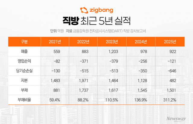 30일 금융감독원 전자공시시스템(DART)에 따르면 직방은 지난해 매출 922억원, 영업손실 121억원, 당기순손실 646억원을 기록했다. 자회사 대손충당금 설정 영향으로 순손실 규모가 크게 확대됐다.
