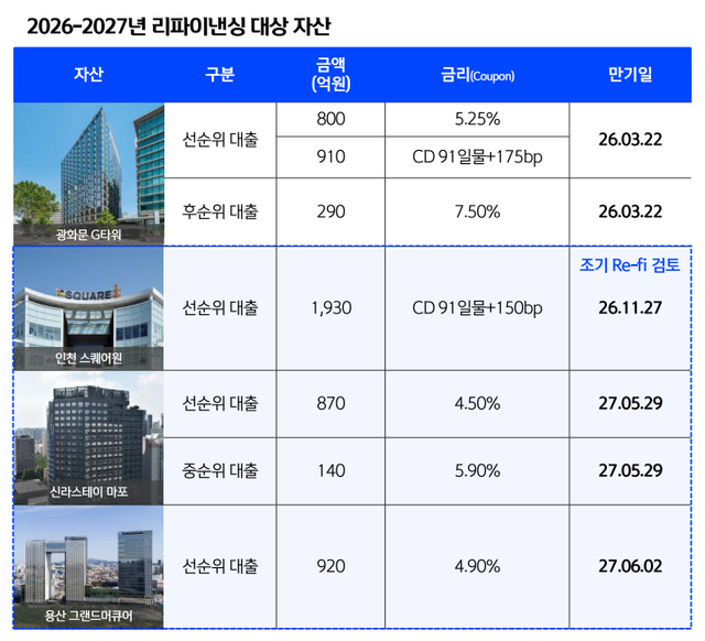 조기 리파이낸싱을 검토 중인 자산은 △인천 스퀘어원 선순위 대출 1930억원 △신라스테이 마포 선순위 대출 870억원, 중순위 대출 140억원 △용산 그랜드머큐어 선순위 대출 920억원 등이다.