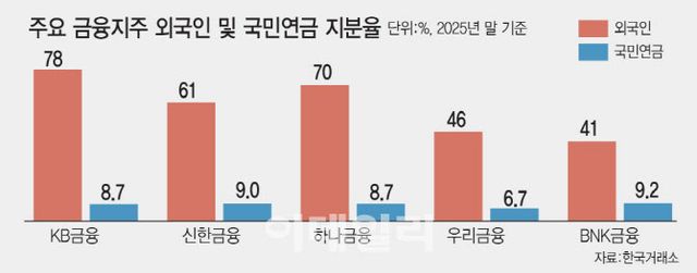 주요 금융지주의 지난해 말 기준 외국인 지분율은 KB금융 78%, 신한금융 61%, 하나금융 70%, 우리금융 46%, BNK금융 41% 등이다. 이들 금융지주의 국민연금 지분율은 KB금융 8.7%, 신한금융 9.0%, 우리금융 6.7%, 하나금융 8.7%, BNK금융 9.2% 등으로 KB·신한·하나금융은 최대주주, 우리·BNK는 2대 주주다. 외국인 지분율이 높은 상황에서 국민연금은 최대주주 지위를 가져도 사실상 지배구조에서 고립돼 주총에서 실질적인 영향력을 행사하기 어렵다는 지적이 나온다. 실제 국민연금은 신한금융의 최대주주로서 진옥동 회장이 과거 신한은행장 시절 라임 사태로 인한 기업가치 훼손 등을 이유로 연임에 반대했지만, 별다른 영향을 미치지 못했다.