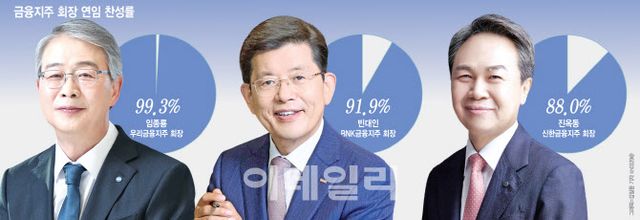 30일 금융감독원 전자공시시스템에 따르면 지난 23일과 26일 각각 주총을 연 우리금융지주, 신한금융지주, BNK금융지주 등의 CEO 연임 안 찬성률은 임 회장 99.3%, 빈 회장 91.9%, 진 회장 88.0% 등을 기록했다. 이런 압도적 찬성률은 외국인 지분율이 높은 금융지주의 특성상 예고된 수순이었다는 분석이 많다. 앞서 글로벌 의결권 자문사인 ISS와 글래스루이스 등은 이번 주총 안건들에 대해 모두 찬성 의사를 밝힌 바 있다.