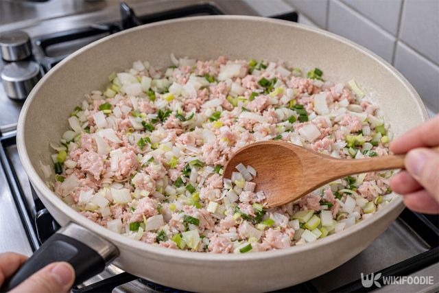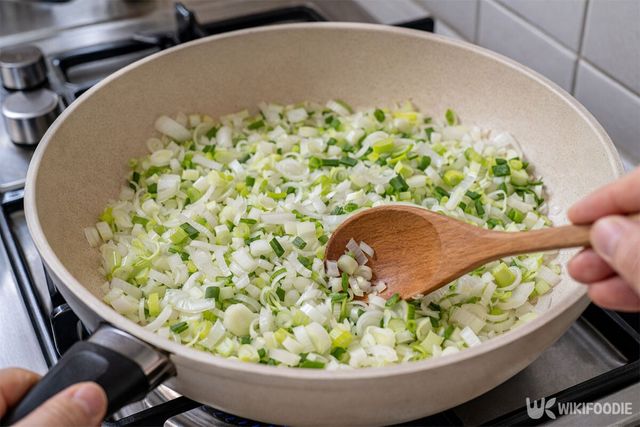 조리는 대파와 양파를 잘게 다져 팬에 볶는 것부터 시작한다. 식용유를 두르고 중간 불에서 충분히 볶아 기름에 향을 입히는 과정이다.