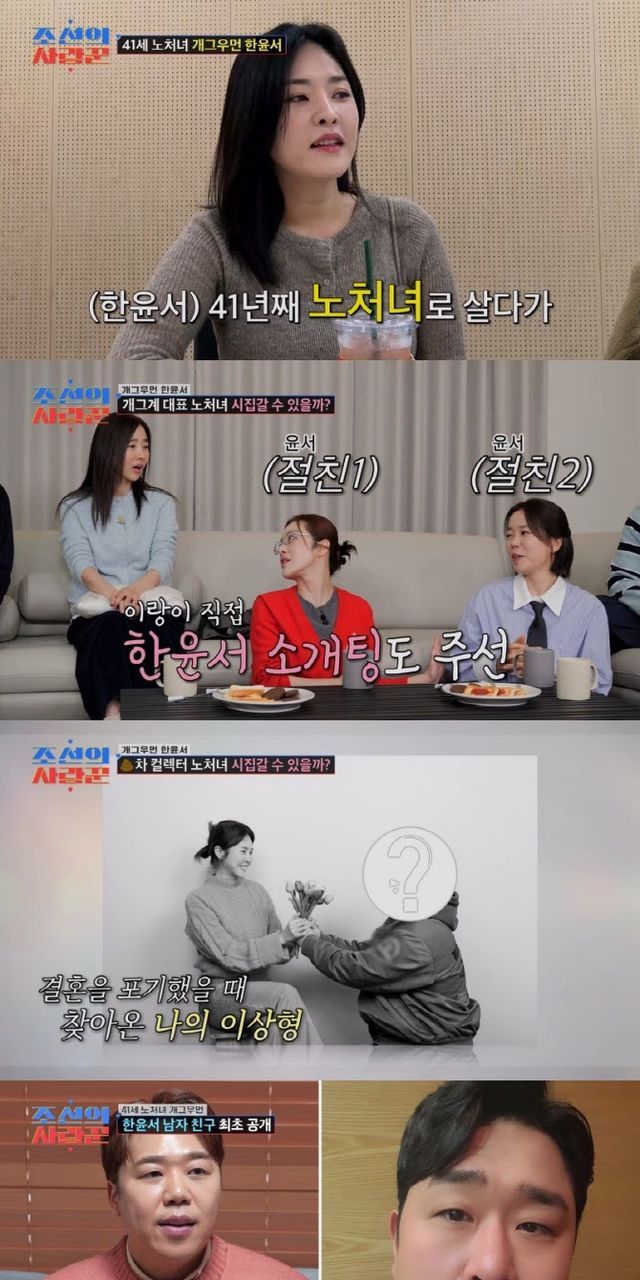 지난 30일 방송된 ‘조선의 사랑꾼’에서는 부모님까지 동원된 공개구혼에도 불구하고 ‘41년 차 노처녀’로 지내던 개그우먼 한윤서가 예비 남편을 깜짝 공개했다. 개그맨 유민상, 이상준, 장동민 등이 축의금으로 수백만 원을 걸었으며 ‘X차 컬렉터’라 불릴 만큼 남자 운이 없었던 한윤서의 과거도 공개됐다. 유튜브 매니지먼트사에 근무하는 예비 남편과 함께 ‘조선의 사랑꾼’의 문을 두드린 한윤서는 “가벼운 마음으로 연애를 하게 된 거였는데, 오빠가 (상처를) 다 치유해 줬다”라며 깊은 애정을 드러냈다.