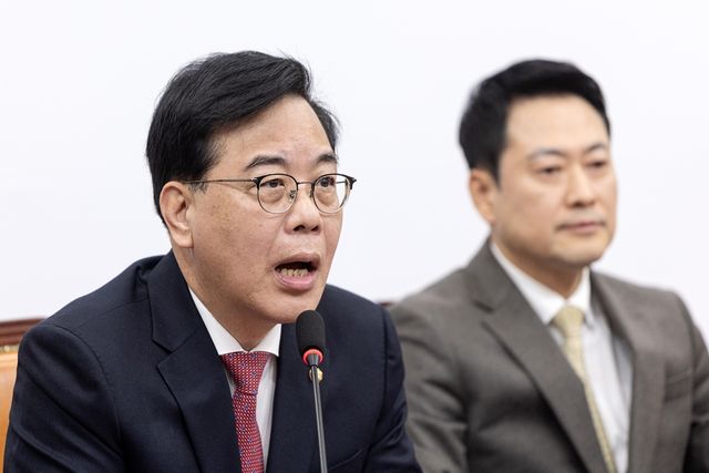 송언석 국민의힘 원내대표가 서울 여의도 국회에서 열린 최고위원회의에서 모두발언하고 있다. 자료 사진. 송언석 원내대표는 31일 서울 여의도 국회에서 열린 원내대책회의에서 "중동 리스크로 인한 경제 불안이 안정세를 되찾을 때까지 국정조사와 특검법 개정 등 모든 정쟁을 중단하자"라고 밝혔다. 송 원내대표는 "이란 전쟁의 장기화는 이미 현실이 됐고 그에 따른 민생 경제 위기도 현실이 됐다"라며 "민생이 위협받는 상황에서 국회에서는 악마의 편집으로 조작된 음성파일 하나를 붙잡고 국정조사의 정쟁에 몰두하고 있다"라고 주장했다. / 뉴스1