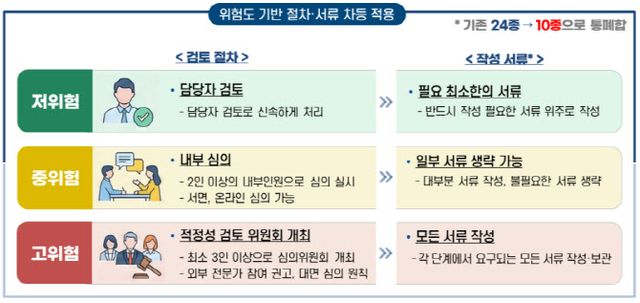 개정안에 따르면 개인정보를 동일 기관 내부에서 통계 작성이나 연구 목적으로 활용하는 경우는 저위험으로 분류된다. 이 경우 별도 검토위원회 없이 담당자 검토만으로도 처리가 가능해지고, 관련 서식도 기존 24종에서 10종으로 줄어든다. 반면 제3자 제공이 이뤄지는 경우에는 정보를 제공받는 기관이 얼마나 안전하게 데이터를 통제할 수 있는지에 따라 중위험 또는 고위험으로 나뉘게 된다.