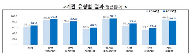 시도교육청(84.3점)과 광역자치단체(82.3점)는 ‘우수’ 수준, 지방공기업(74.6점)과 기초자치단체(60.3점)는 ‘보통’ 수준으로 평가되었다. 특히 기초자치단체는 지난해 ‘미흡’에서 올해 ‘보통’으로 상향됐다.