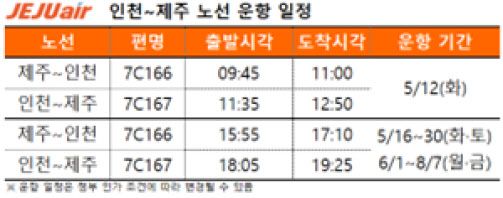 제주항공의 인천~제주 노선은 제주국제공항에서 오후 3시 55분에 출발해 인천국제공항에 오후 5시 10분에 도착하며, 인천공항에서 오후 6시 5분에 출발해 제주공항에 오후 7시 25분에 도착한다. 취항 첫날만 오전 시간에 운항하며, 이후 5월 30일까지는 화·토요일, 6월 1일부터는 월·금요일 일정으로 운항한다.