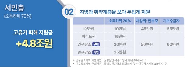 이어 소득 하위 70% 국민에게도 지역에 따라 금액을 달리 지급한다. 수도권은 10만원, 비수도권은 15만원, 인구감소우대지역은 20만원, 인구감소특별지역은 25만원이다. 정부는 고유가와 물가 상승 충격이 지방에 더 크게 미칠 수 있다는 점을 고려해 지역별 차등 지원 방식을 담았다고 설명했다.
