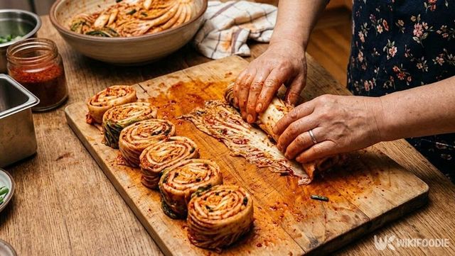 그 상태로 한입 크기로 썰어내면 단면이 동그란 모양으로 나온다. 잎이 바깥을 감싸고 있어서 썰었을 때도 모양이 쉽게 풀리지 않는다. 잎이 넓고 얇은 배추김치일수록 이 방법이 잘 맞는다.
