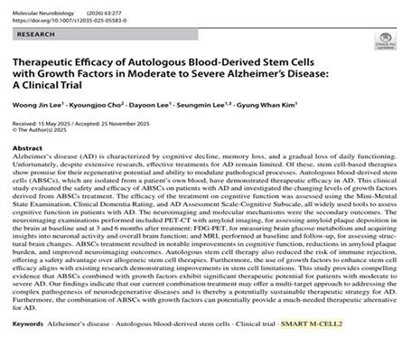 정 원장은 공동 참여한 중증도 알츠하이머 연구 결과도 밝혔다. 해당 연구에 따르면, 중등도에서 중증 알츠하이머 환자에게 미라셀의 스마트엠셀(SMART M-CELL)로 농축한 혈액 줄기세포를 정맥 주사한 결과, 주요 병리 단백질인 아밀로이드가 감소하고 인지 기능 개선 및 뇌 구조 보존 효과가 관찰됐다. 그는 “임상적으로 의미 있는 변화를 확인했다”며 줄기세포 치료의 잠재력을 강조했다.