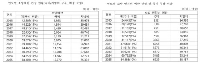 박윤정 입법조사관은 보고서에서 “국가의 책임을 실질화하기 위해서는 인건비를 국비로 지원하는 체계를 강화할 필요가 있다”며 “인건비 부담 완화를 통해 확보된 지자체의 재정 여력은 노후 장비 교체, 청사 현대화 등 소방 서비스 고도화에 투자해야 한다”고 강조했다.