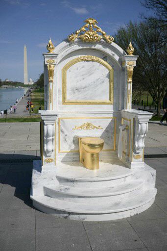 황금 변기 조형물은 게릴라 아트 그룹 ‘시크릿 핸드셰이크(Secret Handshake)’의 최신 작품으로, 이들은 그 동안 트럼프 행정부를 비판하는 여러 설치 미술을 내셔널 몰에 선보여 왔다.