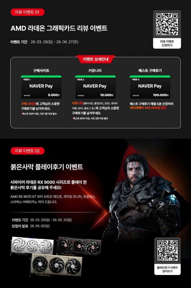 추가로 AMD가 진행하는 리뷰 이벤트에도 참여할 수 있다. 라데온 RX 9000 시리즈 구매 후기 이벤트는 3월 29일부터 6월 27일까지 운영되며, 구매 사이트 리뷰와 커뮤니티 리뷰를 모두 작성하면 네이버페이 포인트 1만5000원이 지급된다. 베스트 리뷰어로 선정될 경우 최대 10만원의 추가 혜택도 받을 수 있다.