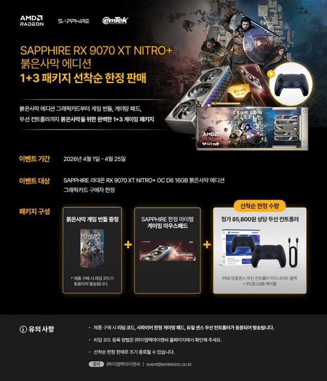 이엠텍아이엔씨가 ‘SAPPHIRE 라데온 RX 9070 XT NITRO+ OC D6 16GB 붉은사막 에디션’ 구매자를 대상으로 4월 프로모션을 이어간다. 이번 행사에서는 기존 1+3 번들 혜택과 함께 AMD 리뷰 이벤트 참여 기회도 제공한다.