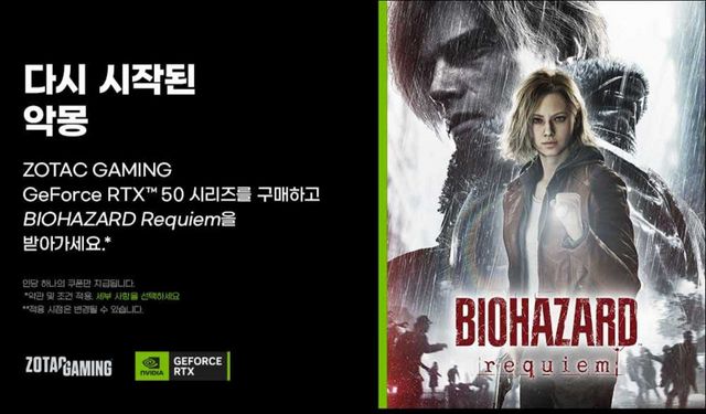 프로모션 대상은 ZOTAC GAMING GeForce RTX 5090, 5080, 5070 Ti, 5070 그래픽카드 또는 해당 제품이 탑재된 시스템이다. 행사 기간 내 구매한 고객에게 한해 ‘바이오하자드: 레퀴엠’ 게임 코드가 제공된다.