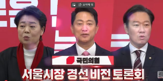 국민의힘은 이날 6·3 지방선거 당 서울특별시장 후보자를 가리기 위한 첫 번째 비전토론회를 열었다. 토론회에는 컷오프를 통과한 오 시장과 송언석 원내대표 비서실장 출신의 박 의원, 당 혁신위원장 출신의 윤 전 의원 3명이 참가했다.