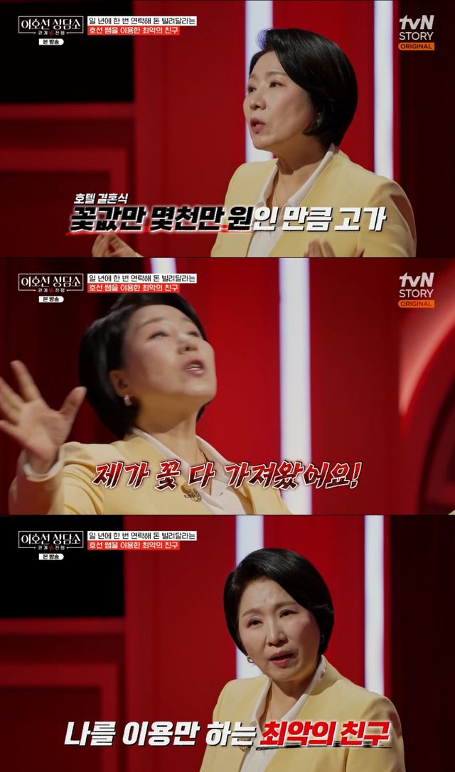 이호선은 "그럴 수 있다. 그러면 우리가 괜찮은 관계라는 걸 연락하며 확인 해야하지 않나"라며 돈이 필요할 때만 연락하던 친구임을 밝혔다.