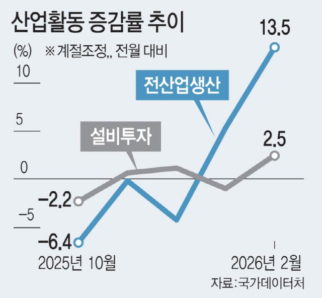31일 국가데이터처가 발표한 ‘2026년 2월 산업활동동향’에 따르면 지난달 전산업생산지수는 118.4(2020년=100)로 전월대비 2.5% 증가했다. 한달 만의 반등이자, 2020년 6월(2.9%) 이후 가장 크게 늘었다. 다만 미국과 이란 전쟁 발발로 이 같은 흐름이 지속할 수 있을지는 미지수다.