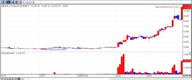 Shares of Celemics, Inc. surged to the daily limit, extending a sharp rally from around won 2,500 earlier this year to above won 10,000 recently. The rise appears driven by expectations of enhanced corporate value following a change in largest shareholder.