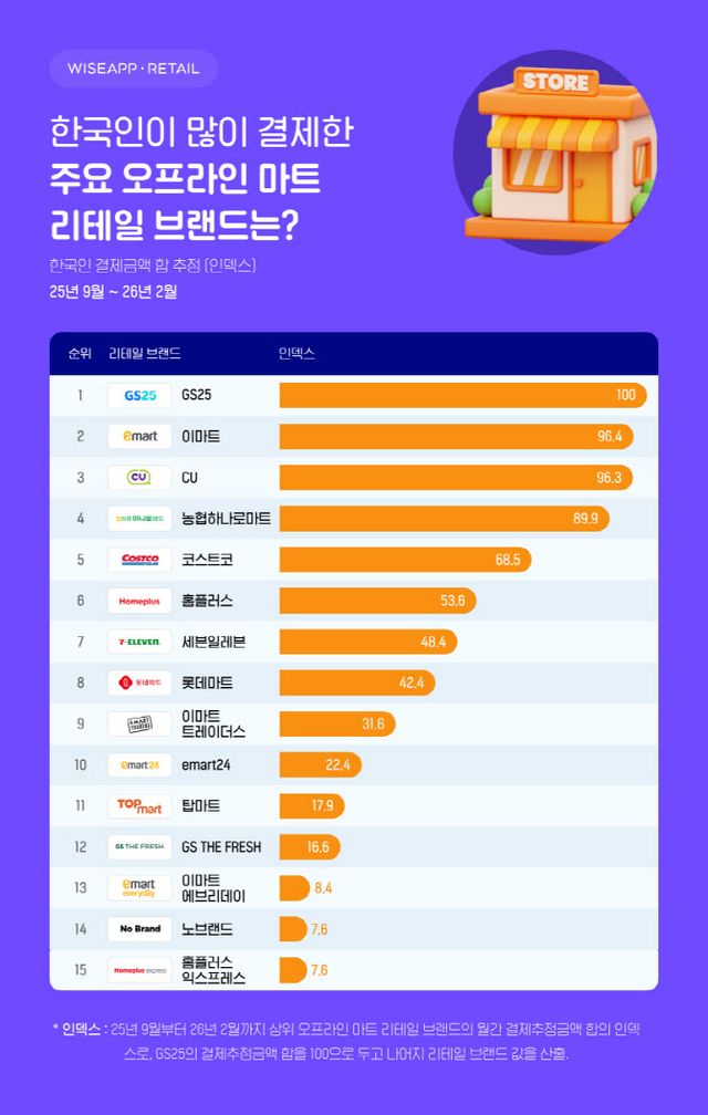1일 앱·결제 데이터 기반 시장분석업체 와이즈앱·리테일이 신용카드와 체크카드 결제 데이터를 표본 분석한 결과, 2025년 9월부터 2026년 2월까지 6개월 동안 오프라인 마트 브랜드 중 GS25의 결제추정금액이 가장 높았다.