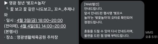 센터 측은 문자 발송 26분 뒤인 오후 5시 51분쯤 다시 정정 문자를 보냈다. 이 메시지에는 앞서 안내한 행사명 ‘벚꼬ㅊ놀자’가 ‘벚꽃놀자’의 오타로 확인돼 정정한다는 내용과 함께 혼동을 드릴 수 있어 다시 안내한다는 취지의 설명이 담겼다. 불편을 드린 점에 대한 양해도 함께 구했다.