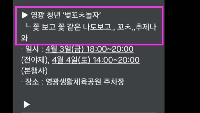영광군 청년센터는 지난 27일 오후 5시 25분쯤 홈페이지 가입자들을 대상으로 센터 프로그램을 안내하는 문자메시지를 보냈다. 문자에는 4월 3일부터 4일까지 영광생활체육공원 주차장에서 열리는 청년 벚꽃축제 ‘벚꽃놀자’와 4월 7일부터 30일까지 진행되는 풋살 클래스 내용이 함께 담겼다.
