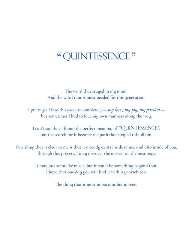 공개된 이미지에는 'QUINTESSENCE'라는 단어와 함께, 의미심장한 메시지가 담겨 있어 눈길을 사로잡는다. '내 마음 속에 머무른 단어, 이 시대가 가장 필요로 하는 단어'라는 언급으로 시작해 '가장 중요한 것은 보이지 않는다'는 문장으로 마무리한 메시지는 궁금증을 자아내며 컴백 기대감을 높이고 있다.