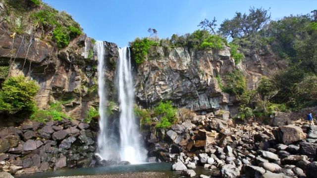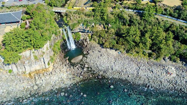 한라산에서 내려온 물줄기가 서귀포 시내를 가로질러 곧장 바다로 쏟아지는 모습은 국내에서 유일하게 바다로 직접 떨어지는 해안 폭포이며, 동양에서도 보기 드문 비경으로 알려져 있다. 깎아지른 듯한 수직 암벽과 그 위를 덮은 노송들이 바다와 어우러진 풍경은 마치 정교하게 그려진 수묵화를 눈앞에서 감상하는 듯한 깊은 인상을 남긴다.