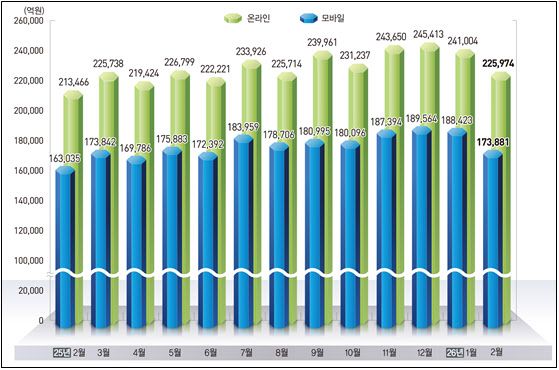 국가데이터처가 1일 발표한 ‘2026년 2월 온라인쇼핑동향’에 따르면 온라인쇼핑거래액은 22조 5974억원으로 전년동월대비 5.9% 증가했다. 이번 거래액은 2017년 관련 통계 작성이래 역대 2월 중 최대다. 같은 기간 모바일거래액은 6.7% 늘어난 17조 3881억원으로 집계됐다.