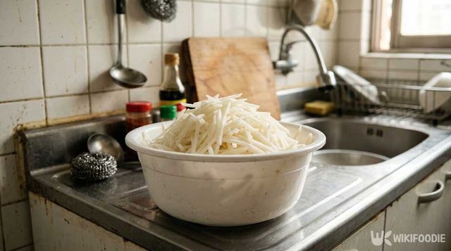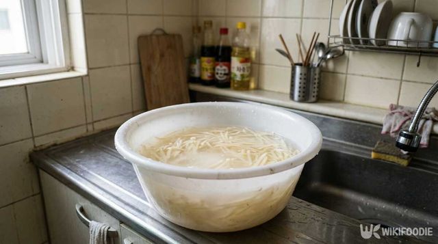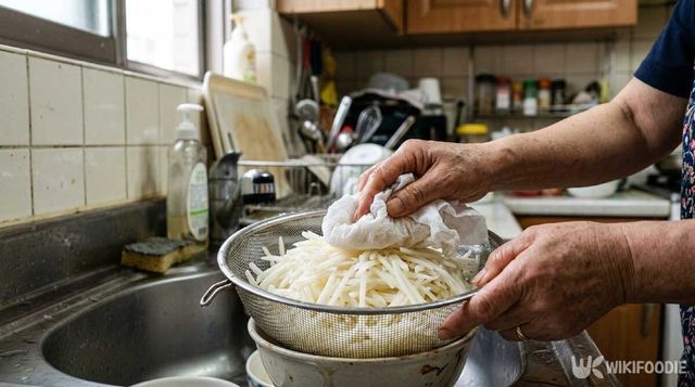 ② 채 썬 감자를 찬물에 2~3분 담갔다가 맑은 물이 나올 때까지 헹궈 전분을 뺀다.