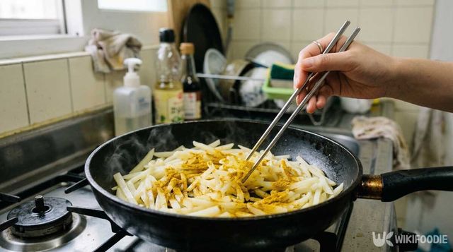 감자가 반쯤 익었을 때 카레 가루를 넣는다. 처음부터 넣으면 카레 향이 날아가 버리고, 너무 늦게 넣으면 골고루 배지 않는다. 이 타이밍이 맛을 결정한다. 카레 가루를 넣은 뒤 중강불로 올려 빠르게 섞으면 향이 감자 전체에 배고 고소한 볶음 냄새가 올라온다. 불 조절을 잘못하면 카레 가루가 타면서 쓴맛이 날 수 있으니 넣은 뒤에는 계속 저어가며 볶는 것이 좋다.