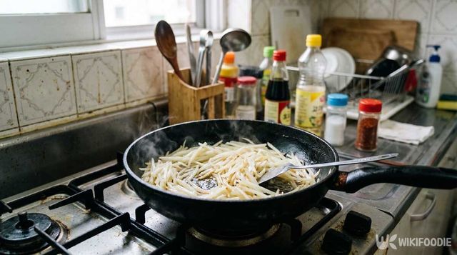 팬을 달군 뒤 기름을 두르고 중불에서 볶기 시작한다. 불이 너무 세면 겉만 익고 속은 생감자로 남거나 탈 수 있다. 처음엔 건드리지 않고 잠깐 그대로 두면 바닥 면이 살짝 익으면서 고소한 냄새가 올라온다. 그때부터 뒤적이기 시작하면 된다.
