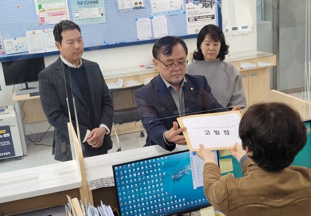 오영훈선거준비사무소 관계자들이 1일 제주경찰청 민원실을 찾아 고발장을 접수하고 있다. 박소정기자