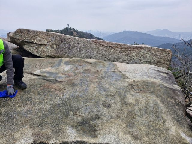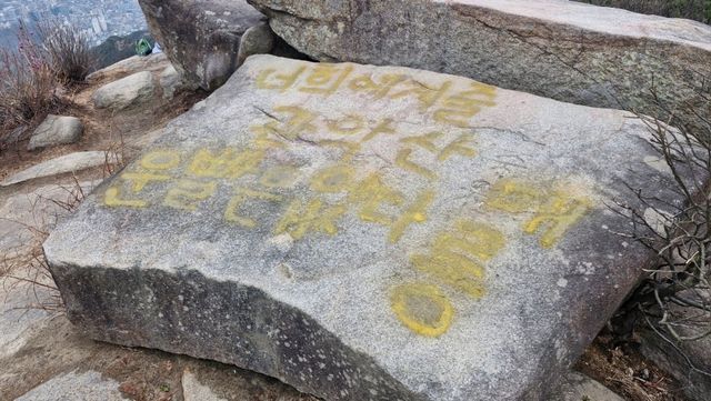 서울 관악산의 명소 마당바위가 래커 낙서로 훼손되며 논란이 커지고 있다.