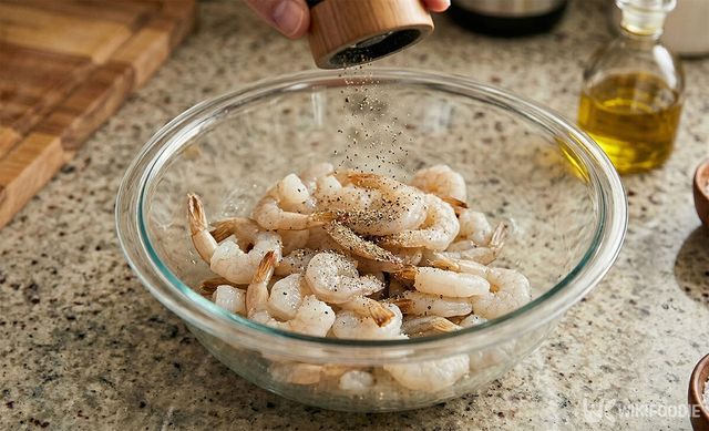 먼저 새우는 껍질을 벗기고 깨끗하게 씻어 물기를 닦는다. 소금과 후추를 살짝 뿌려 밑간을 해둔다. 오래 놔두지 않고 잠깐만 간을 해도 충분하다.