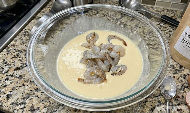 여기에 계란 1개를 넣어 반죽을 만든다. 반죽이 너무 묽지 않게 농도를 맞춘 뒤 새우에 고르게 입혀야 모양이 예쁘게 나온다.