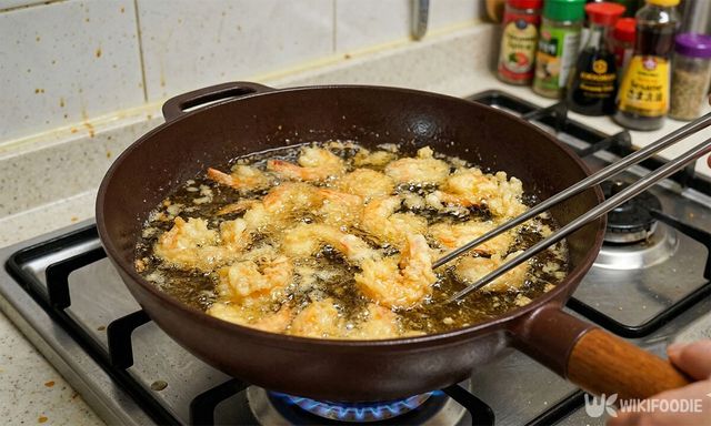 새우를 기름에 넣고 전체적으로 노릇한 빛깔이 돌 때까지 튀긴다. 이때 한꺼번에 너무 많은 양을 넣으면 기름 온도가 떨어지니 주의해야 한다.