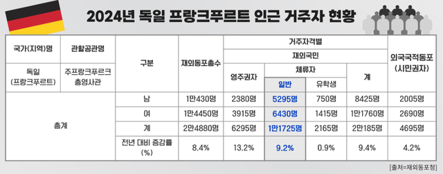 제도적 훈풍에 힘입어 세계 각국의 유능한 인재들이 독일로 유입되고 있는데 그 중에는 한국인들도 다수 포함돼 있다. 재외동포청의 '재외동포현황 2025'에 따르면 지난해 기준 독일은 전 세계에서 한국인이 11번째로 많이 거주하는 국가다. 특히 최근에는 독일 경제의 중심지인 프랑크푸르트 지역에 거주하는 한국인 수가 빠른 속도로 늘고 있다. 2024년 기준 프랑크푸르트 지역의 한국인 일반 체류자 수는 1만1725명으로 전년 대비 9.2% 증가했다. 독일 전 지역을 통틀어 가장 높은 수치다. 유학생과 영주권자, 시민권자 등이 별도로 분류된다는 점을 고려하면 일반 체류자의 상당수는 현지 기업이나 한국 법인 등에 소속된 직장인들인 것으로 풀이된다.