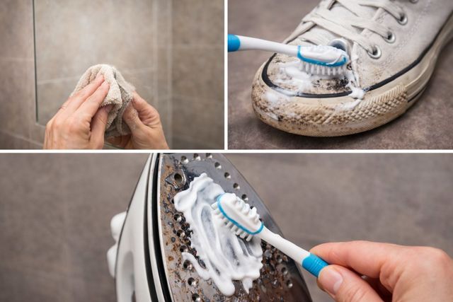 흰색 운동화의 고무 밑창이나 앞코 부분에 생긴 검은 마찰 자국 또한 치약으로 쉽게 지워진다. 신발 전용 세제 없이도 치약을 묻힌 솔로 문지르면 고무 특유의 변색을 방지하며 본래의 흰색을 되찾아준다. 생활 가전 중에서는 다리미 바닥면에 눌어붙은 섬유 찌꺼기를 제거할 때도 사용된다. 전원을 끈 차가운 상태의 다리미 바닥에 치약을 바르고 부드러운 천으로 닦아내면 매끄러운 바닥면을 복구할 수 있다.