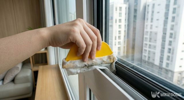 스크래퍼는 끝이 날카롭고 단단해 좁은 틈에 넣기 좋다. 다만, 단독으로 사용하는 것보다 수건과 함께 쓰는 것이 훨씬 효과적이다. 먼저 창틀 위에 젖은 수건을 평평하게 펼친 뒤, 스크래퍼의 뾰족한 끝부분을 그 위에 대고 수건을 감싸듯이 잡아주면 된다.