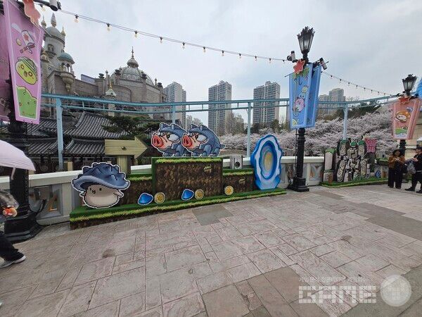 4월 1일 진행된 사전 체험 현장은 기존 놀이공원과는 결이 다른 분위기를 보여줬다. 석촌호수와 벚꽃이 어우러진 야외 공간 위로 보라색 롤러코스터 레일이 지나가고, 곳곳에는 핑크빈과 슬라임 조형물이 배치돼 있었다. 어트랙션을 집합해 놓은 형태라기보다는 하나의 게임 맵을 그대로 옮겨 놓은 형태에 가까웠다.