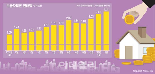 1일 금융권에 따르면 지난 2월 한국주택금융공사의 보금자리론 판매액은 2조 5675억원으로 지난해 2월(1조 4424억원)과 비교하면 1조원 넘게 증가한 것으로 나타났다. 한국주택금융공사는 올해 보금자리론 공급 규모를 20조원으로 설정했는데 지난 1월(2조 4147억원) 판매분까지 합치면 2개월 사이 올해 목표액의 25%를 채운 상황이다.