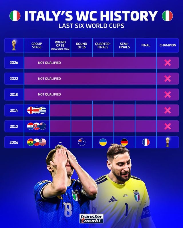 이탈리아는 전날(1일) 보스니아헤르체고비나 제니차의 빌리노 폴리에 스타디움에서 열린 대회 유럽 예선 PO A조 결승서 120분 동안 1-1로 비긴 뒤 승부차기서 1-4로 무릎을 꿇었다. 이탈리아는 지난 2018년 러시아 대회를 시작으로 3개 대회 연속 월드컵 본선행에 실패했다. 이탈리아는 월드컵 통산 4회 우승을 차지한 강국이지만, 마지막으로 본선을 누빈 건 12년 전이다.