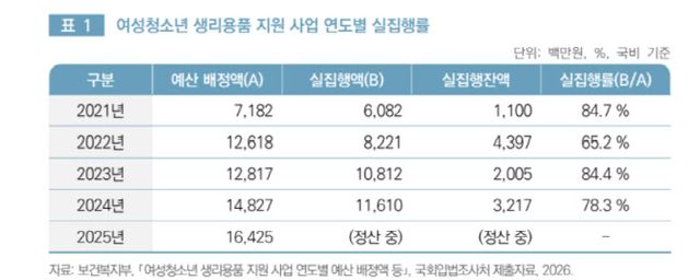 정부는 현재 취약계층 여성청소년을 대상으로 월 1만 4000원의 생리용품 바우처를 지원하고 있지만 제도의 실효성에도 의문이 제기된다. 지원 대상자는 온·오프라인 신청 후 별도로 국민행복카드를 발급받아야 하며, 특히 14세 미만은 보호자 동의가 필수다. 이 같은 이중 신청 절차와 낮은 접근성으로 인해 실제 집행률은 2024년 기준 78.3%에 그쳤다.