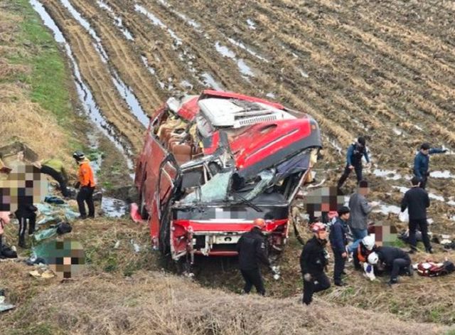 영상에 따르면 도로 2차로에 정차 중이던 승용차가 갑작스럽게 불법 유턴을 시도했다. 이 과정에서 1차로를 주행하던 45인승 통근버스가 승용차와 충돌한 뒤 중심을 잃고 맞은편 가드레일을 돌파해 약 10m 아래 논밭으로 추락했다.