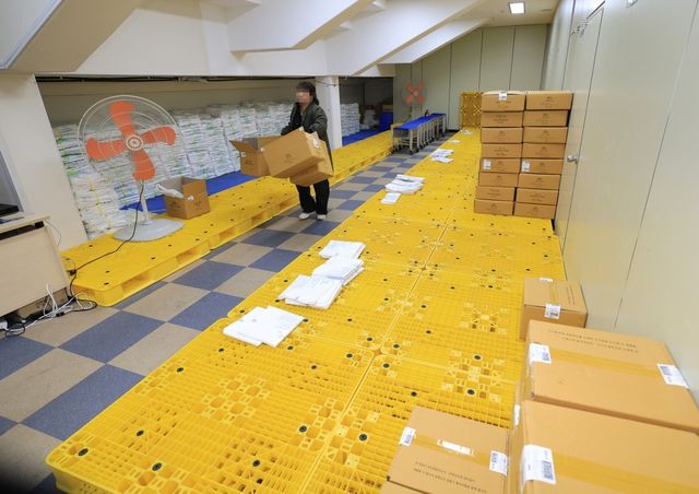 중동사태 여파로 인한 비닐 원료 수급 불안으로 종량제 쓰레기봉투 사재기 현상이 나타나는 가운데 지난 달 26일 오전 제주시 오라동에 위치한 제주시 생활환경과 종량제 쓰레기봉투 창고에서 관계자가 재고를 정리·점검하고 있다. / 연합뉴스