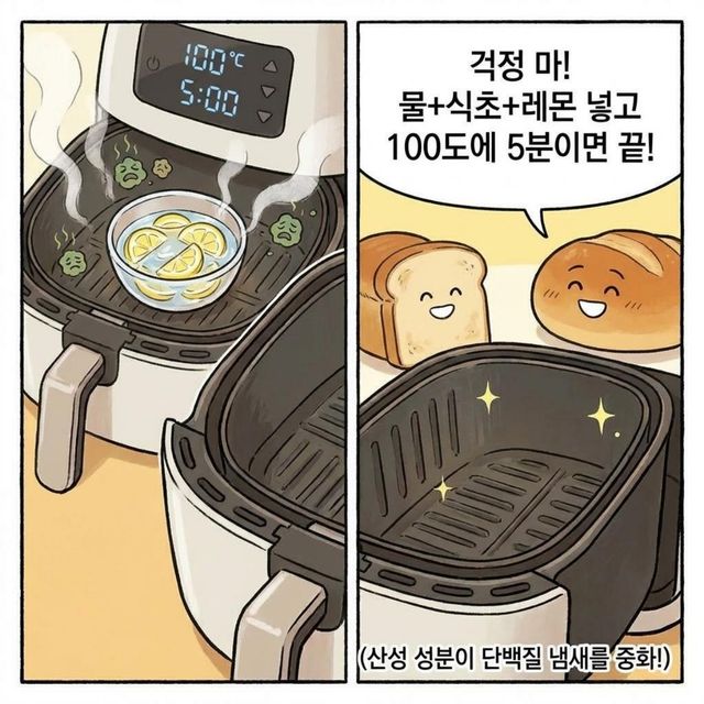 생선구이 후 에어프라이어에 남은 비린내는 다음 요리에 영향을 줄 수 있다. 이를 해결하기 위해서는 바구니에 물과 식초, 레몬 조각을 넣고 100도에서 5분간 가동하는 세척법이 효과적이다. 이는 산성 성분이 생선의 단백질 냄새 입자를 중화시켜 내부를 탈취하기 때문이다.