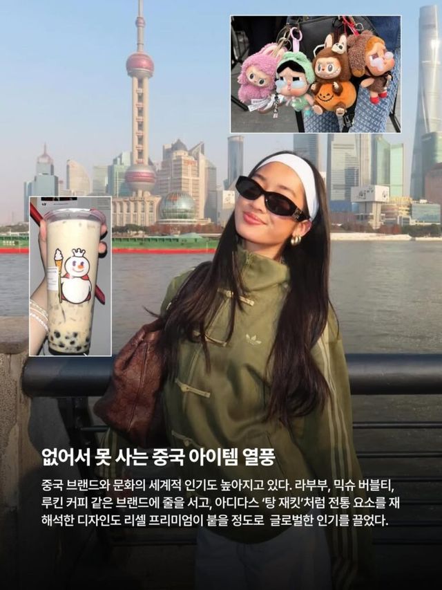 중국 브랜드와 문화의 세계적 인기도 높아지고 있다. 라부부, 믹슈 버블티, 루킨 커피 같은 브랜드에 줄을 서고, 아디다스 ‘탕 재킷’처럼 전통 요소를 재해석한 디자인도 러셀 프리미엄이 붙을 정도로 글로벌한 인기를 끌었다.
